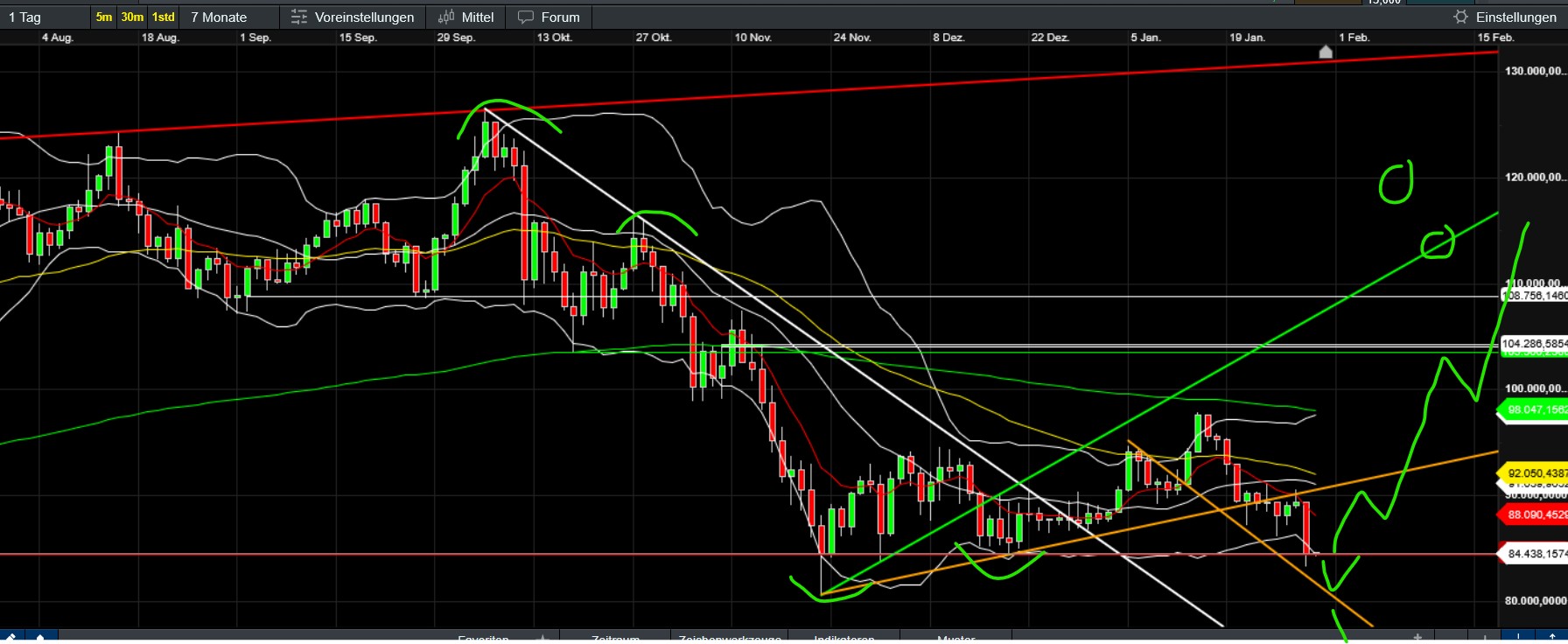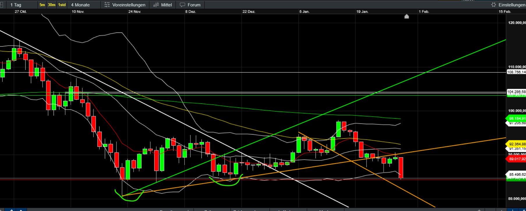 Nach wie vor ermüdend genauso wie dass mein Text jetzt 3x abgestürzt ist… daher nur Chart und die Feststellung, dass die 89000-92000 wichtig wären zu überbieten. Ist aber unwahrscheinlich daher würde sich eventuell sogar ein Short anbieten. Unten zumindest kein Beinbruch solange die 86000 hält…Max. Ziele oben allerdings mittlerweile auch mau (98000, 102000 etc)…