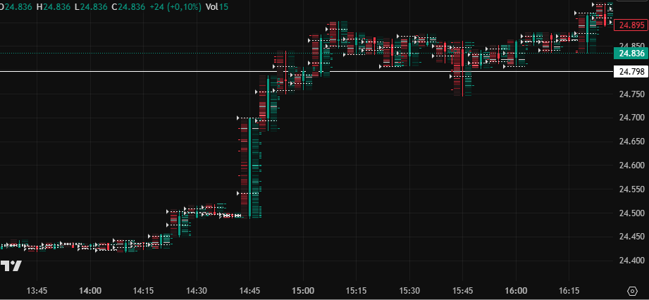 Im WTI kommt die markante Volumenspitze mit dem aggressiven Abverkauf ungefähr gegen 14:24 bis 14:25. Dort beschleunigt Öl plötzlich, das Delta kippt stark negativ und der Markt zeigt echten Initiativdruck.