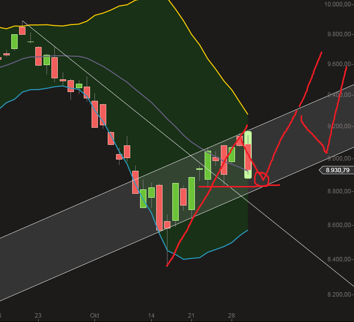 Hier nochmal: Wir nahmen an, dass wir noch eine Konso sehen, Supportbereich hierfür bei 8800 Punkten. Ich habs mal eingezeichnet. letztlich war der Keil auch noch nicht vom Tisch, wir sahen die letzten Tage einen Test der Ausbruchslinie