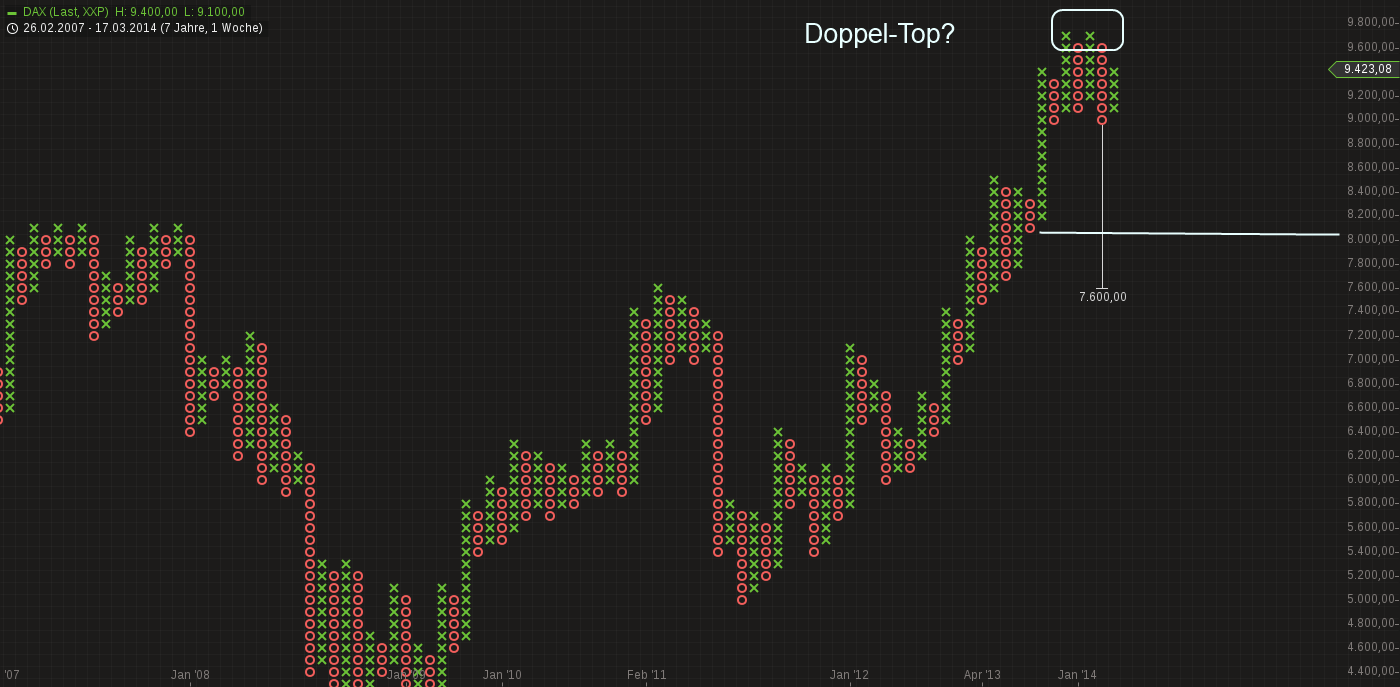 Im Moment scheint der Bullenmarkt vorbei zu sein...erst über 9800 geht es damit weiter...Bärenmarkt mit Ziel im P&F von 7600 ist eingeläutet...starke Unterstützung bei 8000...