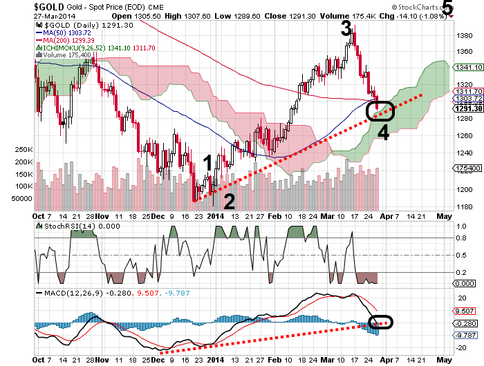 Interessanterweise ist der Goldkurs an dem oberen Rand der Ichimoku Wolke angekommen....etwas ist noch Platz nach unten in dem 1280 er Bereich....Dort verläuft auch die Unterstützungslinie.....Dort wäre die Elliott Welle 4 beendet...
