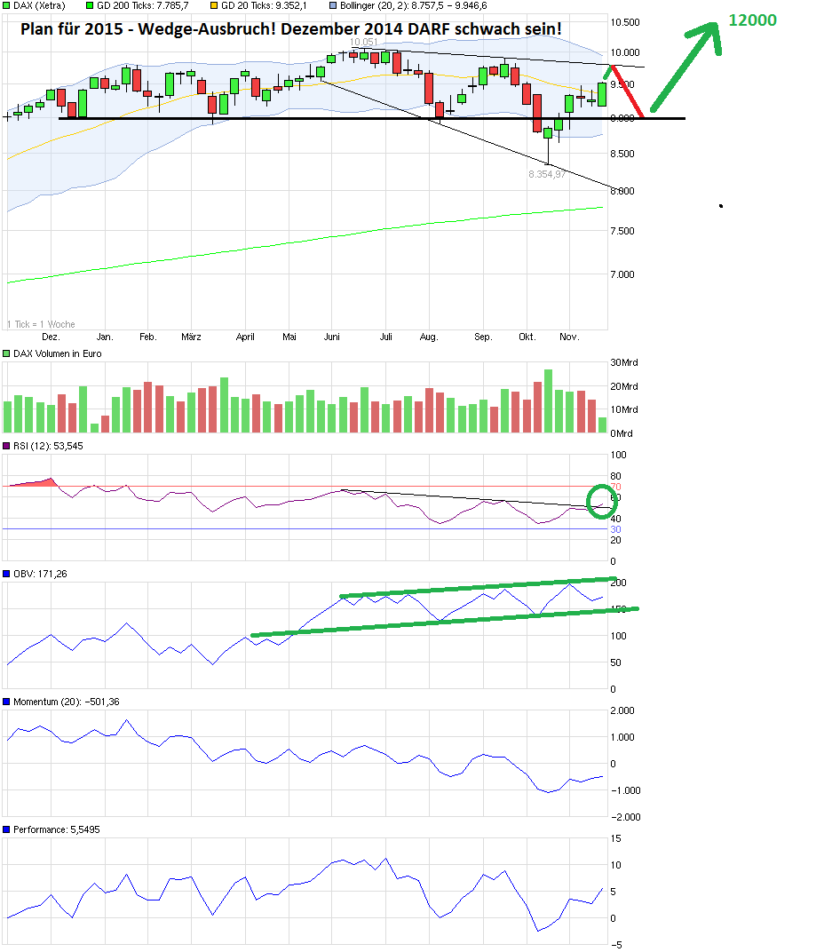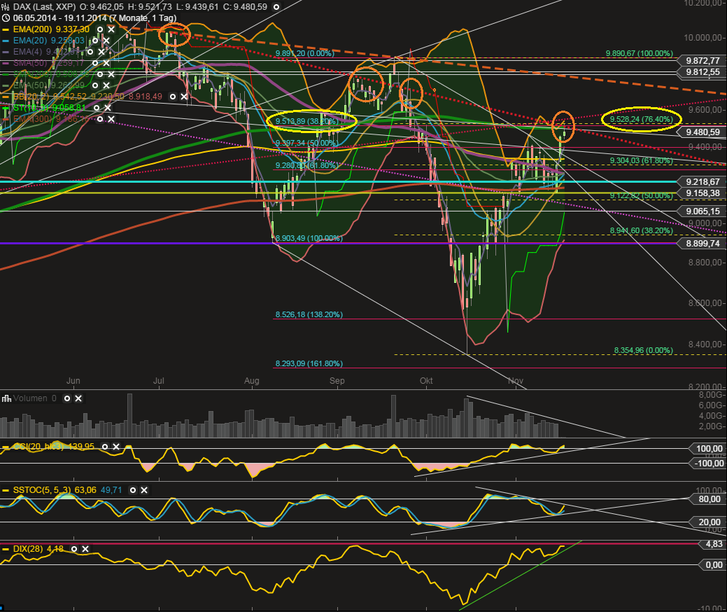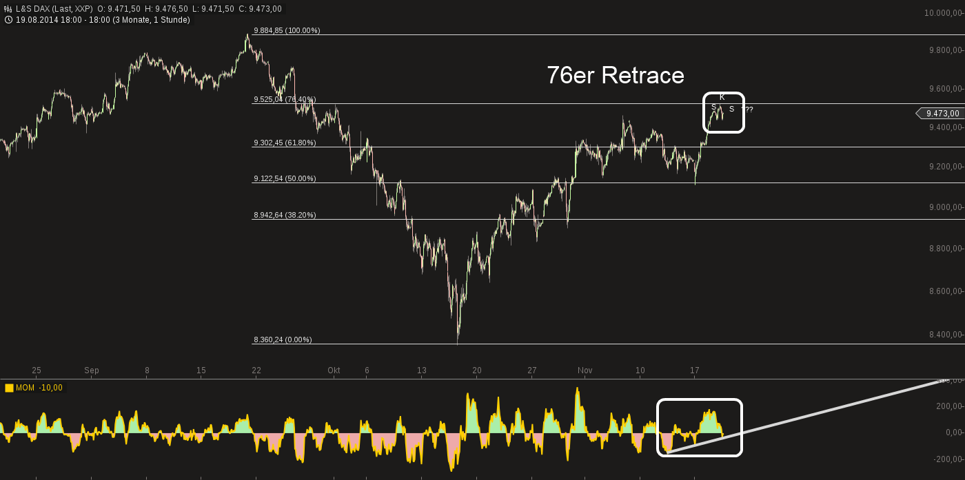 Gegen dieses Szenario spricht im Moment noch das Momentum. Das Momentum ist immer noch bullish und hat noch kein "Sell" Signal erzeugt. Ist sehr, sehr knapp....sollte dies geschehen, würde es auf die schnelle auf die 9300 zugehen...