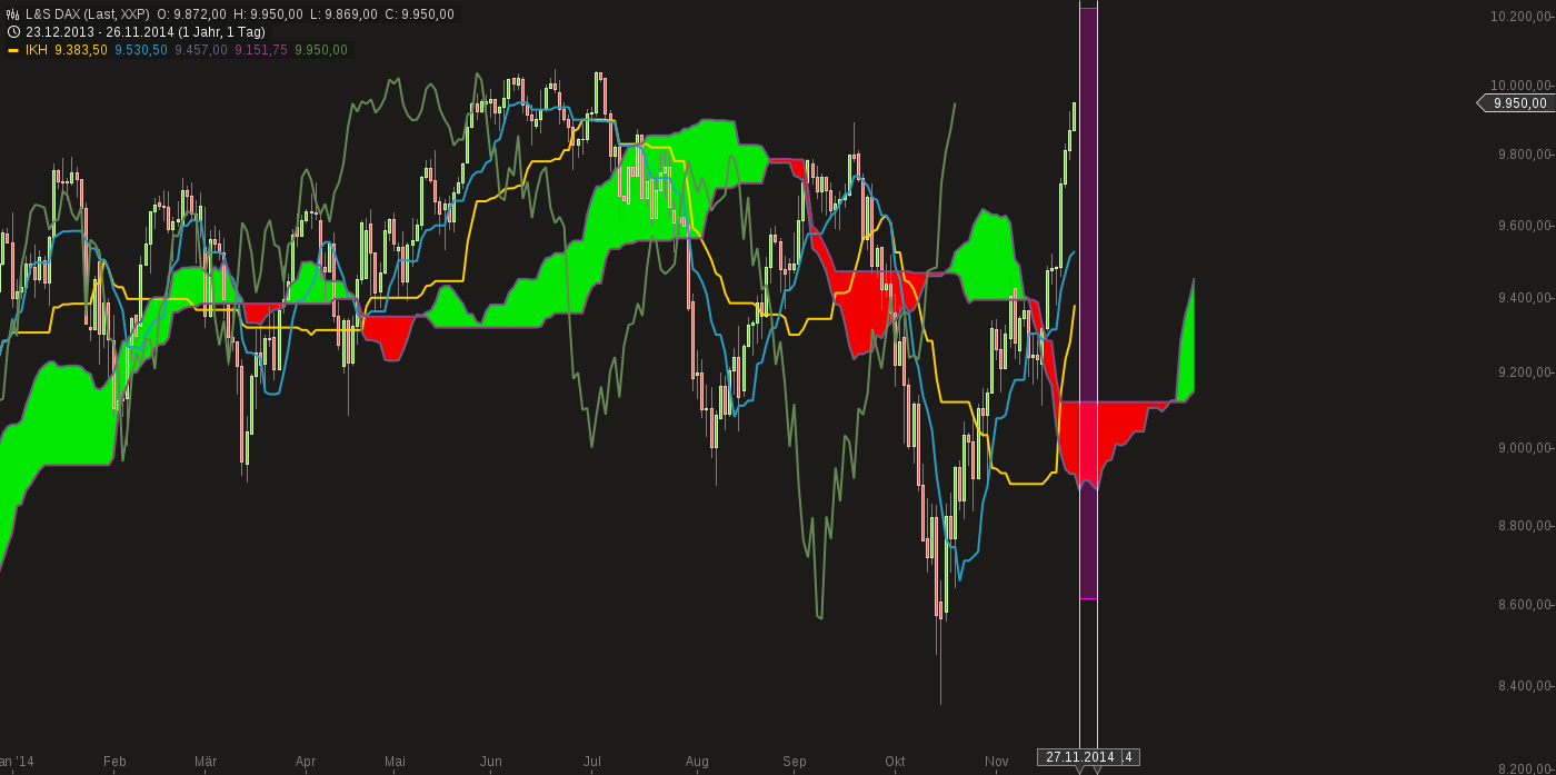 Würde er fallen, so wäre die blaue Linie zunächst Support....bei 9530.....ansonsten wäre auch die obere Wolkenlinie ein Auffangbecken....die verläuft bei 9130.:=) In diesem Szenario müsste die Korrektur Morgen/Übermorgen anfangen und bis Weihnachten dauern....