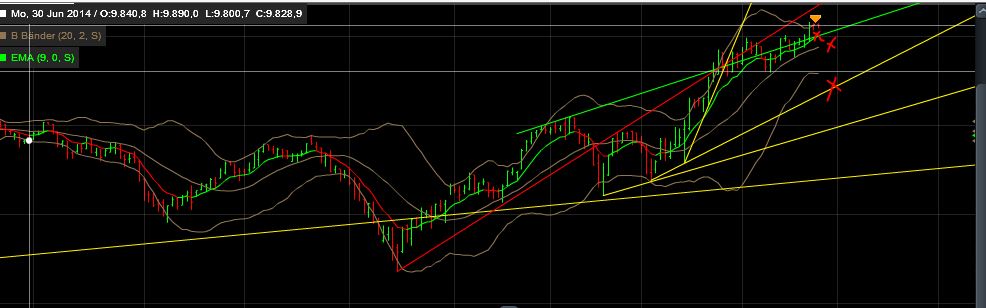 Also (1) man hält weiter diese Aktien und (2) falls man noch keine hat kauft man entweder im Falle eines Rücksetzers in die Nähe des grünen Durchschnittes welche, oder man wartet bis ein Verkaufssignal da ist (Durchschnitt dreht nach unten) und kauft dann spekulativ Short- Papiere.
