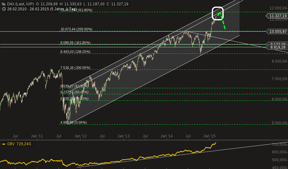 Auch hier sieht man, dass das Volumen extrem zurückging, DAX allerdings in den Himmel stieg. Dies bestätigt den DAX monthly seit 2011.