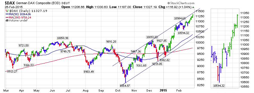 Der aktuelle Anstieg des Trendkanals läuft mit ca. 70% p.a., also die Erwartung der Aktionäre an die Leistungsfähigkeit der deutschen Unternehmen bezüglich Gewinnwachstum ist derzeit gewaltig hoch. Oder geht man von einer aktuell starken Unterbewertung deutscher Unternehmen aus?