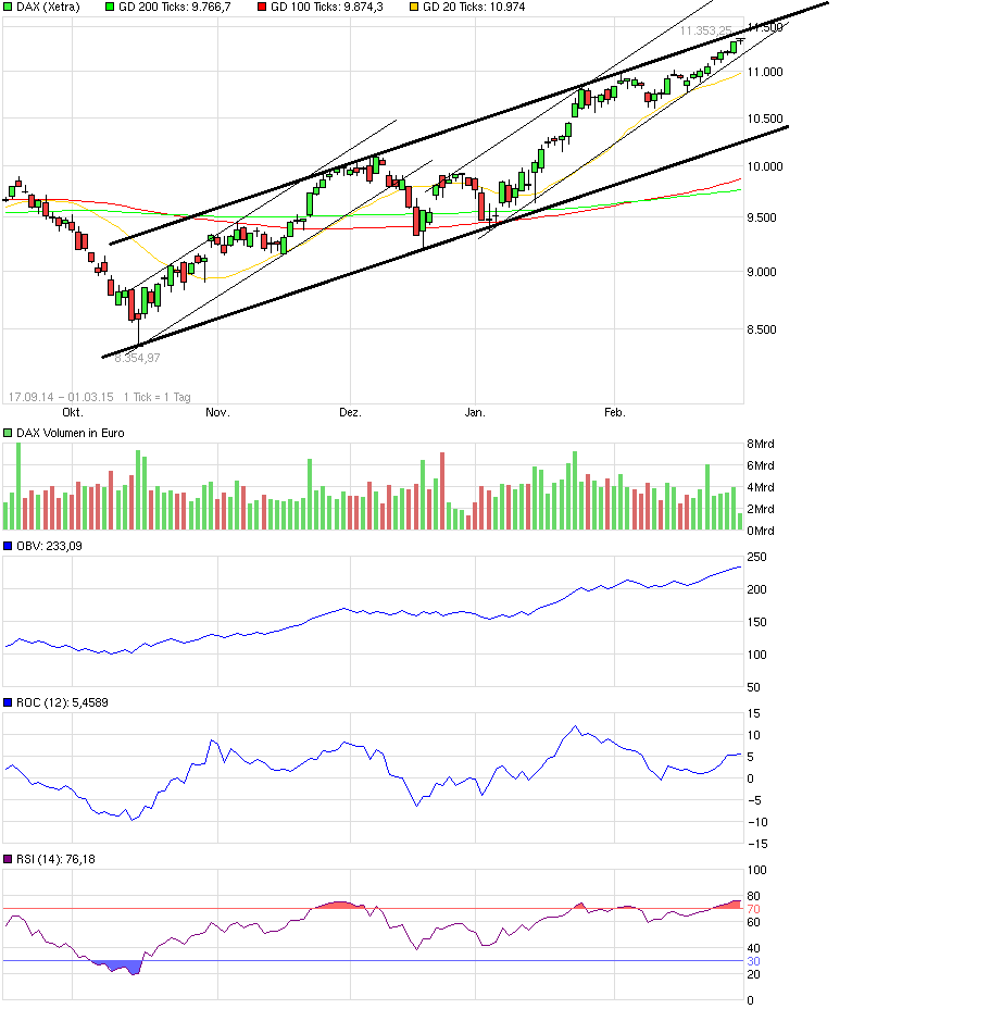 Ein Rücksetzer in den Bereich von 10000 wäre auch recht "gesund". Kommt dieser Rücksetzer nicht bald und der DAX bricht sogar über die obere Trendkanal-Linie aus, so wäre die Entstehung einer Blase zu erwarten. Und Blasen enden niemals schön für jene, die zu spät reingehen oder rauskommen.