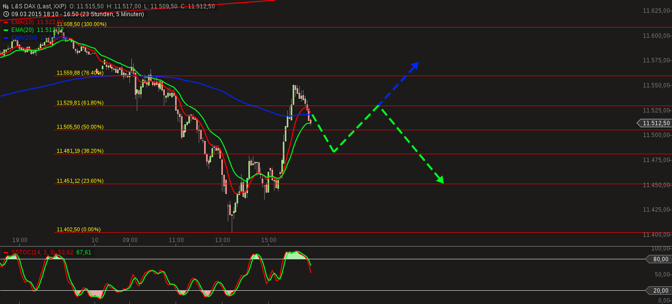 werden noch mal bis zum 38er Retracement fallen mit erneuter Gegenbewegung bis zum 61er (grüner Pfeil) von dort dann entweder abprallen bis zum 23er oder es geht weiter gen Norden... (blauer Pfeil).