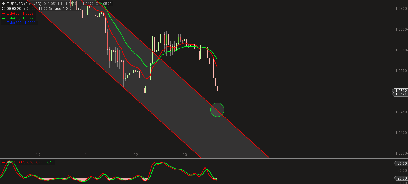 würde ich erst long gehen wenn er von der oberen Kanalbegrenzung des Abwertskanals abprallt (grüner Kreis). Der fällt noch durch die Unterstützung des letzten Tiefs bei 1,0494.