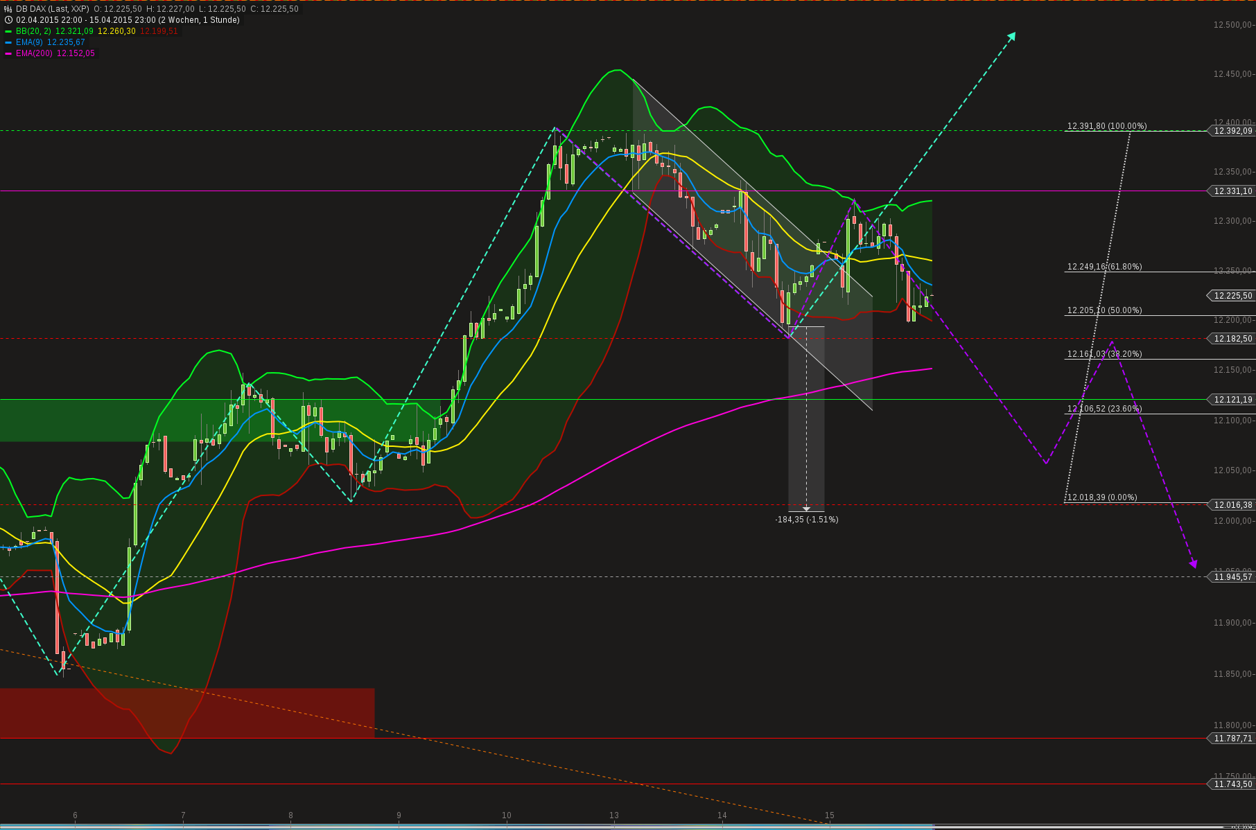 Diese Positionen sind zwar zum Teil aufgelöst worden, tendenziell aber immer noch vorhanden. Und so kann man davon ausgehen, dass der DAX zum kleinen Verfallstag am 17. April wohl unterhalb der 12.400er Marke gehalten werden soll, damit diese Positionen nicht ins Plus laufen. Das dürfte auch der Grund sein, warum der DAX trotz des Ausbruchs in das nächste Rechteck erst einmal an der 12.400er Marke gescheitert ist. Ein idealer Abrechnungskurs läge wohl bei ca. 12.100 Punkten. Allerdings ist bei kleinen Verfallstag die Prognosegenauigkeit dieser Analysemethode etwas niedriger. Mal schauen, was der DAX so bis Freitag macht.