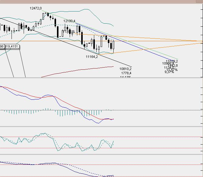 - steilere Abwärtstrendlinie blau, aktuell um 11630 verlaufend..