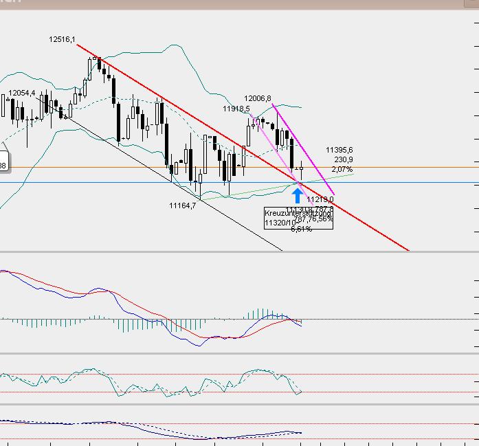 - desweiteren können wir jetzt eine Lila Abwärtstrendkanal einzeichnen, die untere rosa Begrenzungslinie schneidet die blaue, grüne und rote, die blaue Kreuzunterstützung um 11310/20 sowie die grüne Aufwärtstrendlinie sind Rettungsanker für die Bullen, darunter würden die Mai-tiefs 11164 in den Fokus rücken, möglicher Doppelboden dann...