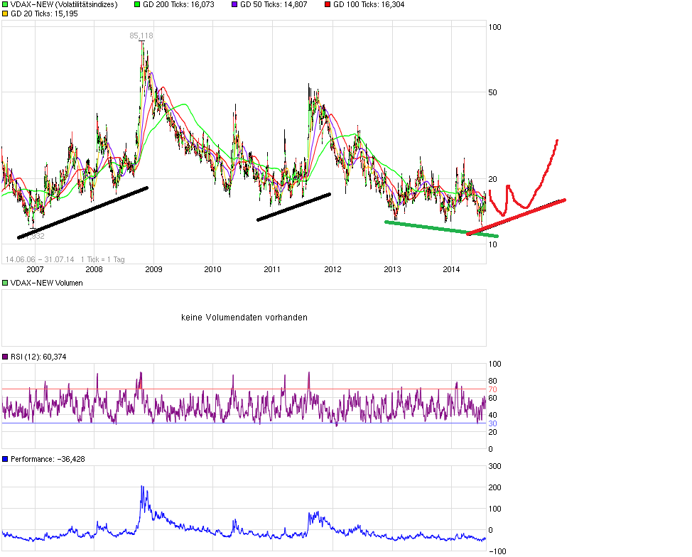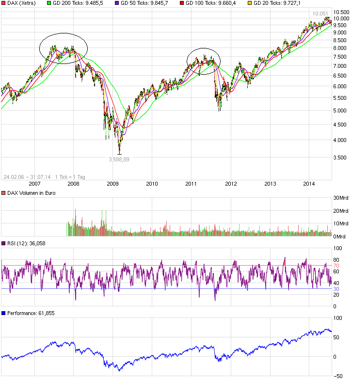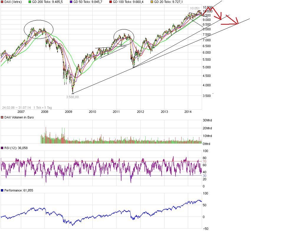 naja,den bullenmarkt würde ich mal noch nicht in frage stellen,selbst nach -1000 pkt.selbst -1300 pkt sind im rahmen des möglichen ohne den langfristigen trend zu zerstören.wäre nur ein pullback an die ausbruchszone des 13 Jahre andauernden Dreiecks. darunter wirds übrigens auch gaga,weil wir dann bald bei KBV < 1 sind :D