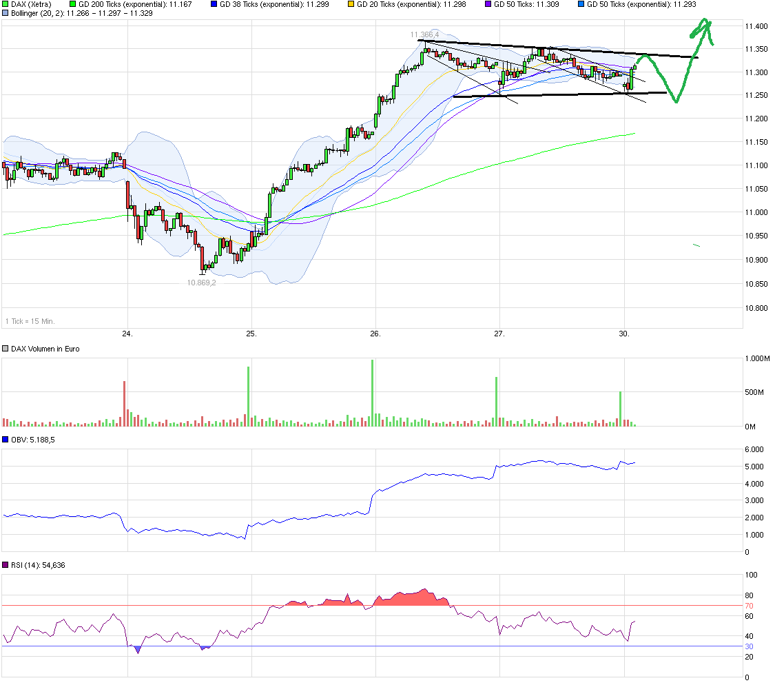 - unterschreitet der Dax sein Tagestief bei 11240, dann short.....Ziel des Ausbruchs zur Unterseite könnte erstmal das Tagestief 11158 vom Freitag sein., fällt der Dax dann noch unter 11150, dann könnte man seine Shorts ausbauen, Ziel könnte dann der Bereich 11050~ sein, dort verläuft am Montag ungefähr die grüne steile Aufwärtstrendlinie, kann der Dax den steilen Aufwärtstrend nicht halten und fällt unter 11050, dann könnte man die Shorts weiter ausbauen und das pot. Ziel könnte der flache Aufwärtstrend sein...
