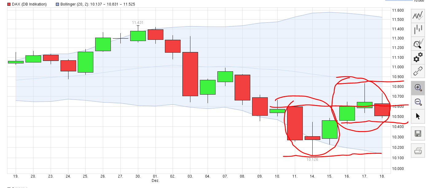 Blicken wir auf die normale Candle, so sehen wir eine Rangekerze (Inside-Day) mit 10733 TH und 10542 TT und Xetraclose um 10600 (geht als Trendtag down durch..)