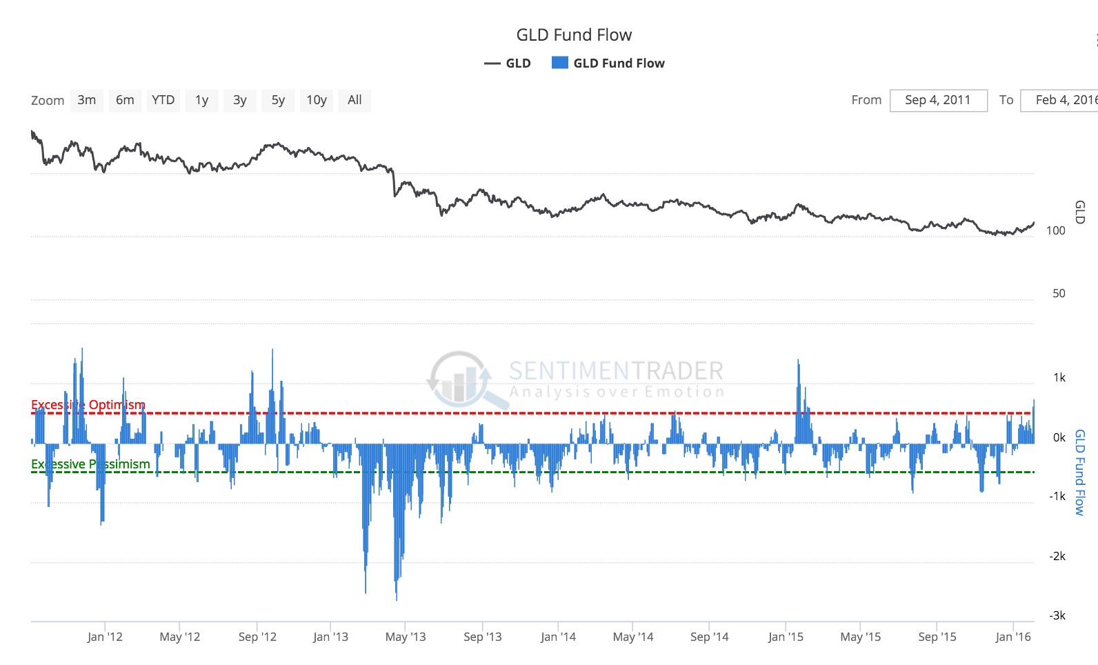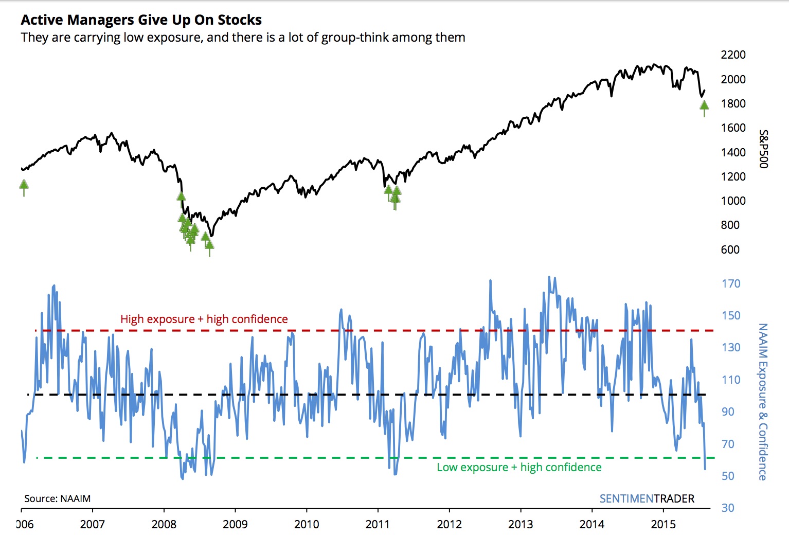 Active investment managers aren't just bearish, they're confident about it. According to the National Association of Active Investment Managers (NAAIM), the average manager had stock market exposure of 22% this week. The exposure reported by an individual manager can vary anywhere from -200% (leveraged short) to +200% (leveraged long). When aggregated with all the other managers and averaged, the actual minimum was -4% (early October 2011) and the maximum was +104% (late January 2013). This week's average of 22% ranks in the bottom 10% of all weeks since 2006. Even if the managers are showing an extreme in exposure, there might be a wide variance in the results, suggesting that as a group, the managers aren't all that confident. That was not the case this week. The standard deviation in responses ranked in the bottom 6% of all readings since 2006. For a comparison, the last time that managers' exposure was below 25%, last September, the standard deviation in responses ranked in the top 70% of all readings, meaning they were not very confident in their bearishness. What this means is that not only are managers showing extremely low stock exposure this week, there is a lot of groupthink among them. The chart above shows a combination of the average exposure of these managers and the standard deviation among responses. In order to create this indicator, we added the standard deviation among responses if managers' average exposure was below 50%. We added the inverse of the standard deviation if exposure was above 50%. That allows us to see in one figure the overall conviction of this group of managers. This week, the combined figure fell to 54% (exposure of 22% plus the standard deviation of 32%). That's the lowest since October 2011 and is the 9th-lowest reading out of 501 weeks of data. It's not like this group is a bunch of amateurs. While they are trend-followers, they reduced exposure as stocks were peaking in 2007, 2011 and 2015 and were aggressively long during the protracted uptrend in 2013-14. Like any group, however, there tends to be trouble when almost everyone is leaning one way and there isn't much variability among them. As a group, they have had lower exposure than this week's 22%, so there is room for it to fall further if stocks continue to struggle. That's what happened during the crash in 2008, but it is not typical. We'd be more inclined to consider this a positive for stocks, due to the fact that the managers are so universal in having low exposure.