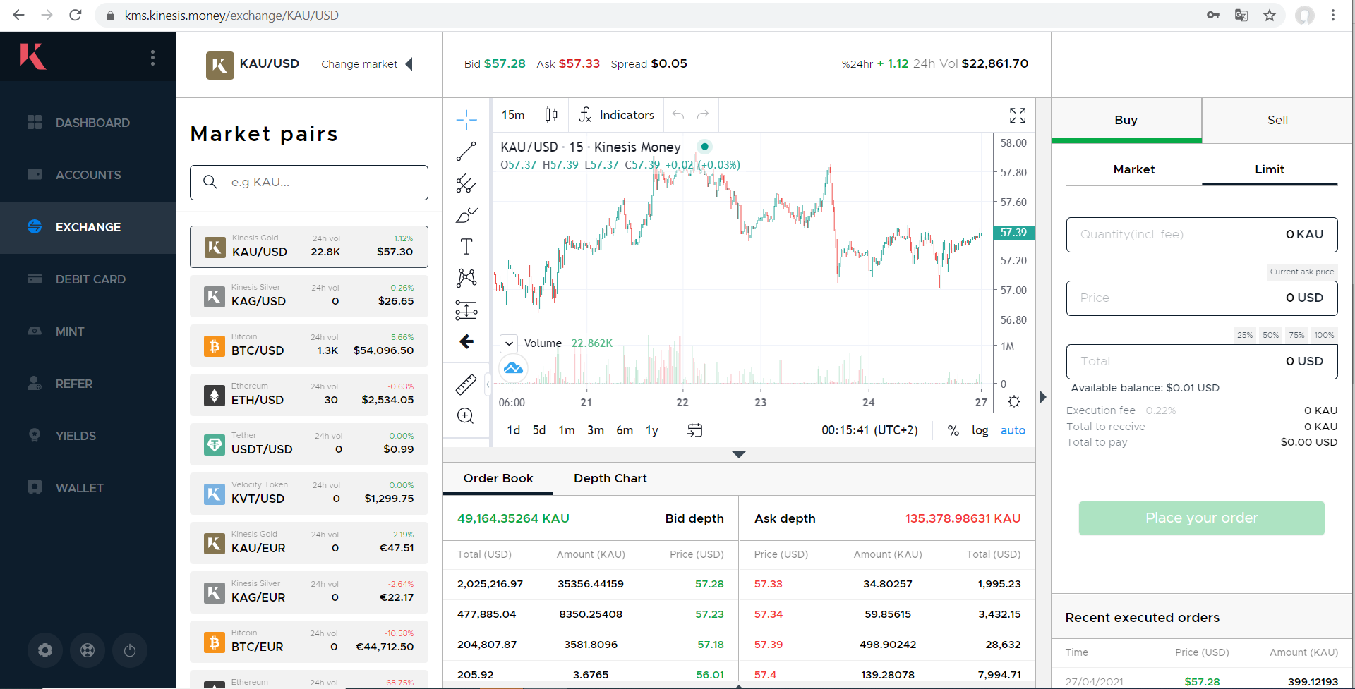 Es gibt zwei verschiedene Tokenarten, den Kinesis Velocity Token (KVT) und die Edelmetall gedeckten Token KAU (Gold) und KAG (Silber).