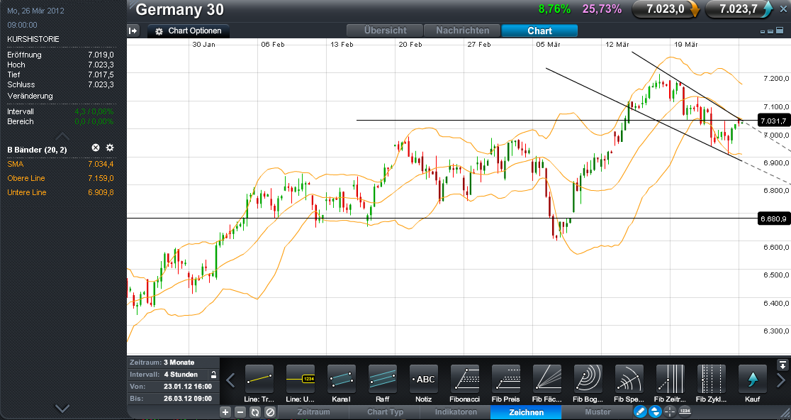 Der DAX sackte am Freitag zunächst nochmals deutlich durch, beendete den Handelstag jedoch wieder mit einem leichten Gewinn. Auf tieferem Niveau scheinen immer schnell wieder Käufer zuzugreifen, die es jedoch bisher nicht geschafft haben, die Korrektur zu beenden. Das wird allerdings langsam Zeit, denn die Aufwärtstrendlinie vom November gerät sonst wieder unter Beschuss. Sollte sie brechen, wird eine größere Korrektur wahrscheinlich. Insbesondere wenn die tieferen Unterstützungen zwischen 6600 und 6800 Punkten den Fall nicht aufhalten können. Käme es hingegen zu einem deutlichen Überschreiten des Freitagshochs zu Wochenbeginn, dann dürfte die Korrektur beendet sein und ein neuer Angriff auf die mittelfristige Abwärtstrendlinie bei ca. 7250 Punkten starten.