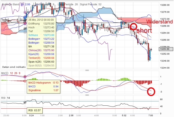 Der jüngste kräftige Anstieg beim DAX kurz vor dem Terminverfallstag wurde nicht mehr durch die Indikatoren bestätigt. Im Gegenteil: Hier bilden sich deutliche Divergenzen zum Kursverlauf, die Vorbote einer größeren Trendwende sein können. Auch mit der Abwärtstrendlinie ausgehend von den Jahreshochs 2011 scheint der Index seine Probleme zu haben. Auf der Unterseite üben offene Kurslücken Anziehungskraft aus, die nun nach und nach geschlossen werden (2 wurden bereits geschlossen). Außerdem sehen wir eine laufende fünfte Aufwärtswelle in der Bewegung seit Ende November - das sollte zur Vorsicht mahnen. Diese Welle muss allerdings noch nicht zwangsläufig zu Ende sein.