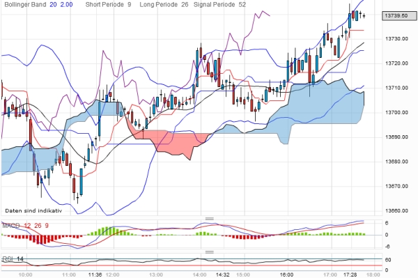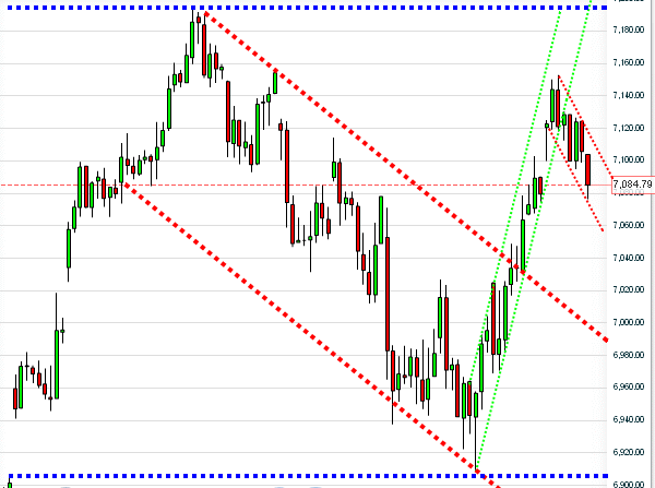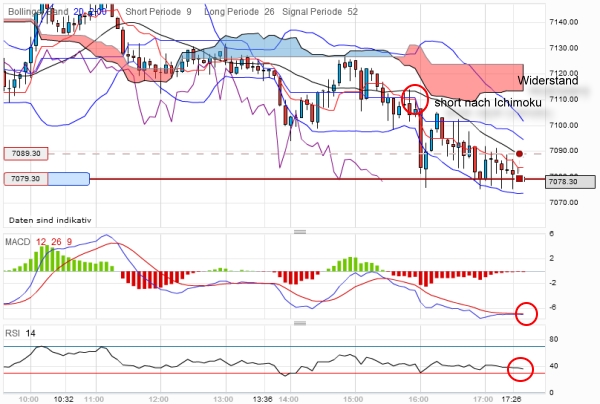 Wer short ist kann im Tageschart auf ein Doppeltop hoffen. Es ist aber ein Hoffen und noch lange keins. Wird nämlich erst unter 6900 ausgelöst.