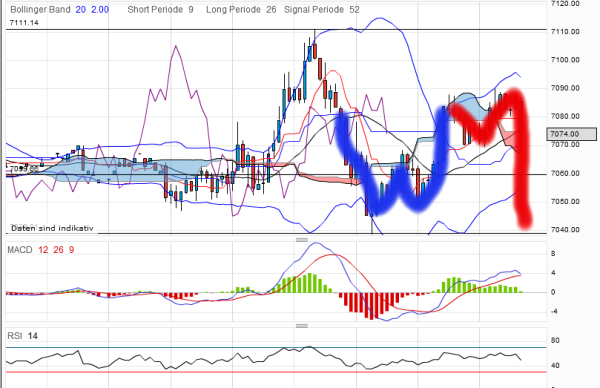 Abprall nun an der 70 (obere Begrenzung im Downtrend kurzfristig) eröffnet Ziel 7020.