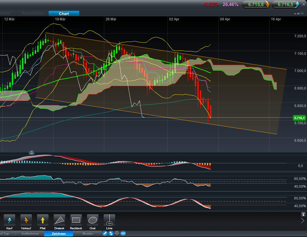 Ich würde es lassen. Solange die 6.770 nicht wieder zurück erobert sind, kann ein Retest der 6.683 jederzeit erfolgen. Was die Amis noch mitzureden haben steht auch noch in Sternen. Derzeit schein es so, dass die Europärer und Asianten abverkaufen und Nachmittags noch einmal die Amis Ihre Depots lehr machen. Ich denke der BigBoss Germany hat gesagt Schluss jetzt. D.h. aber lange noch nicht das sich bspw. Goldman anschließt. Das sind globale Spielchen, von denen wir hier nur 1 % mitbekommen, da bin sich sicher. Es geht nur darum den anderen in die Parade zu fahren und wenn Schwergewichte die Seite wechseln, dann ist das ein Indiz aber noch lange nicht verlässlich, denn man weiß nie ob Häuptling Gespaltene Zunge und Häuptling Messer im Rücken die Wahrheit sprechen. Daher: Schön die Füße still auch wenns schwer fällt.