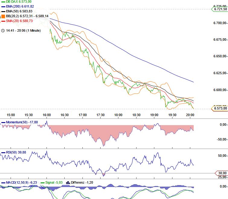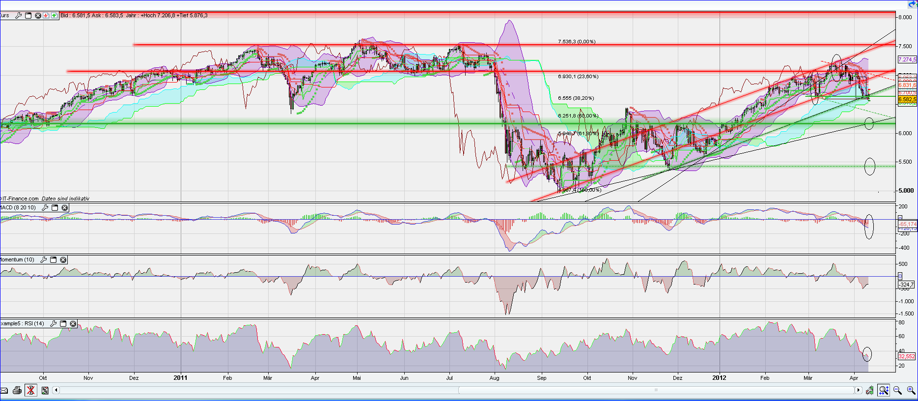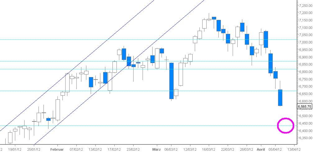 Ausblick: Es wurde ein weiteres Down Gap kreiert. Somit muss der FiBo RT neuberechnet werden. Das erste RT befindet sich bei ca. 6580. Wird dieses unterschritten, muss mit einem Abfall an das 50er RT bei ca. 6400 gerechnet werden.
