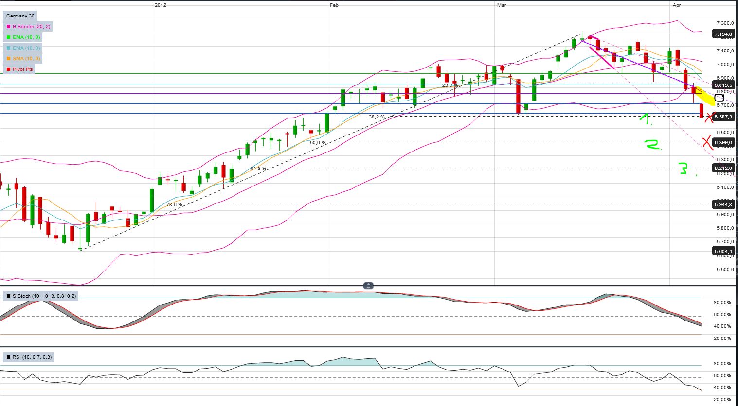 Mit einem Anlaufen als Bullisher Konter der lila Line bei ca. 6700 muss gerechnet werden (das "o" aus x-x-o und gelbe Markierung). Sollte diese Marke fallen. Wäre die fallende Keiloberkante bei ca. 6800 als Primärziel, das mBB (Sekundärziel) bei 7000 und das oBB (Tertiärziel) wieder aktiv.