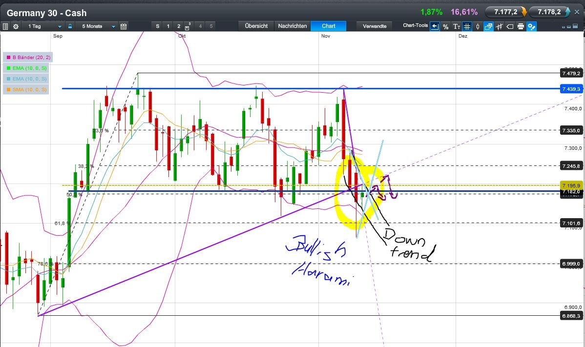 Im Gegensatz zu Remy, seh ich ein Bullish Harami - Muss allerdings morgen per grünem EOD-Stand bestätigt werden. Sehr viele Widerstände liegen auf dem long-Weg vor uns... (7182/195) + Kreuz und diagonal Widerstände.
