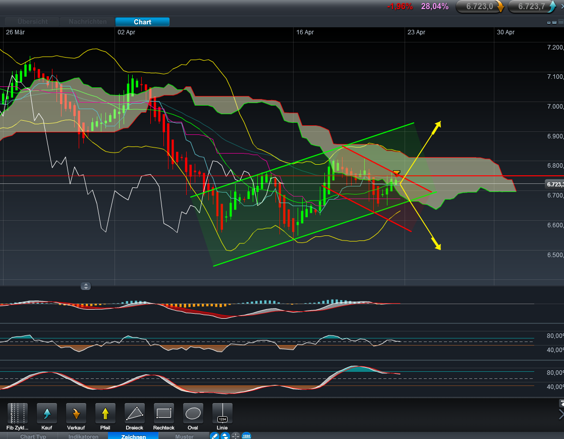 die letzten Tage zwischen 6650 und 6800. Es dürfte in den nächsten Tagen m.E. eine Entscheidung über den Trend anstehen, der eher nach unten gerichtet sein dürfte. Das Plus im Dax beruhte am Freitag aufgrund der Stärke des Euros durch die Aufstockung der IWF-Mittel.
