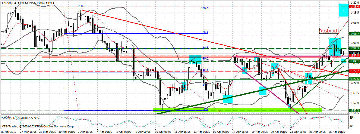 Dieser ist gestern aus seiner vor einer Woche bereits vermuteten „rechtwinkligen fallenden sich verbreiternden bullischen Formation“ ( violett) gemäß Bulkowski ausgebrochen. Spanienbedingt erfolgt heute ein Pullback an das Aussbruchsniveau bei 1388 F.