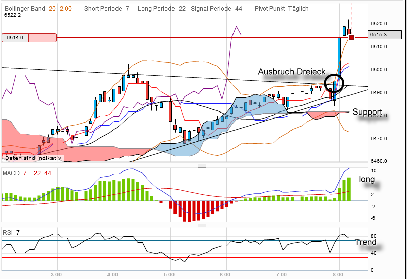 7 Minuten und dann geht kurz auf die 6.510 und dann sehen wir die 6.400 so schnell nicht wieder. :-) Zumdindest nicht in dieser Woche.