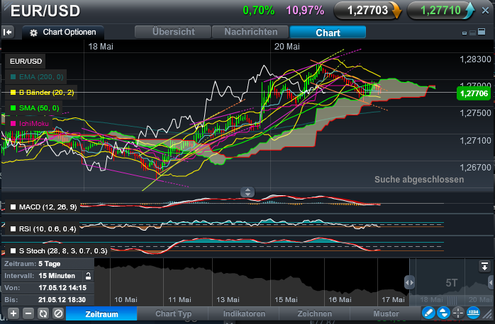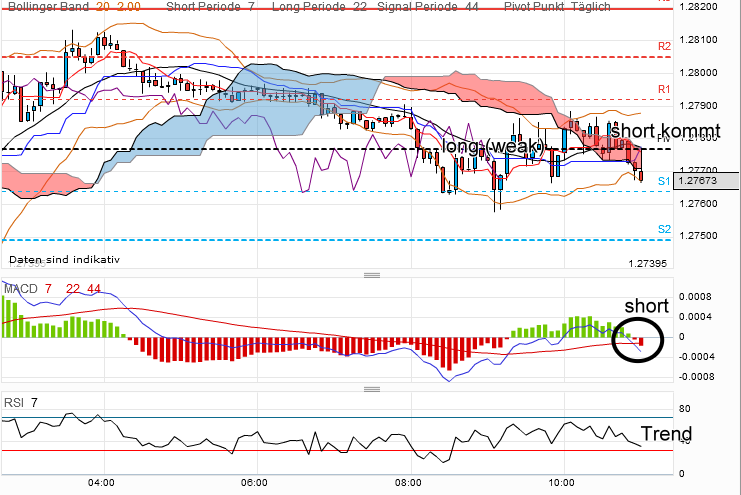 ....wir verwenden 2 vers. Einstellungen, ich sehe im 15er bei keinen optimalen Short! Also sagen wir es einmal so, ich würde jetzt bei dem akt. Euro Kurs 1,2769....keinen Short reinlegen. Aber seit geraumer Zweit wissen wir ja, dass der Dax und Euro nicht synchron laufen!