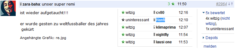 | Wertung | Antworten | Thema | Verfasser | letzter Verfasser | letzter Beitrag | |
