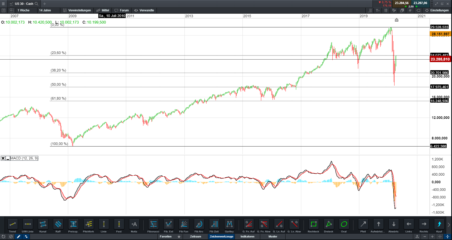 Als Chart habe ich mal den FIBO vom 2009 Tief an das ATH 2020 gelegt, und siehe da, so schlecht ist die reine Interpretation der Fibo´s nicht und auch das der Dow einen Hüpfer nach oben macht verwundert nun nicht mehr.