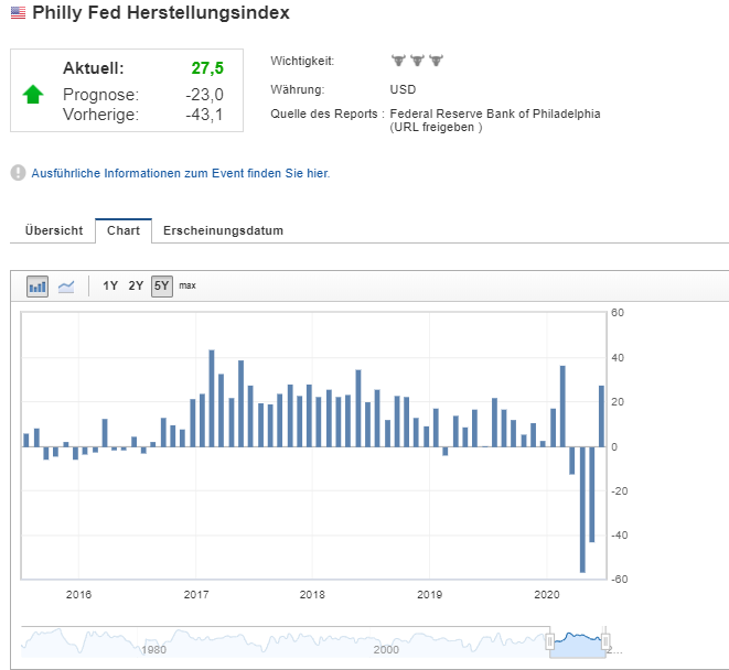 Der von der Philadelphia Fed erhobene Index misst die Lage im produzierenden Gewerbe in Philadelphia. Indexwerte über 0 signalisieren eine positive Geschäftsentwicklung der Industriebetriebe im Vergleich zum Vormonat, während bei einem Fall unter 0 mit einer negativen Geschäftsentwicklung zu rechnen ist. Es werden Fragebögen an 200 Hersteller in Philadelphia geschickt. Der Philly-Fed-Index gilt als Frühindikator für den Einkaufsmanager ISM. Wenn er höher als erwartet ausfällt, führt das auf den Devisenmärkten in der Regel zu einem steigenden Kurs des US-Dollar (USD). Umgekehrt sinkt der Kurs des US-Dollar (USD), wenn die Analystenschätzungen deutlich verfehlt werden.
