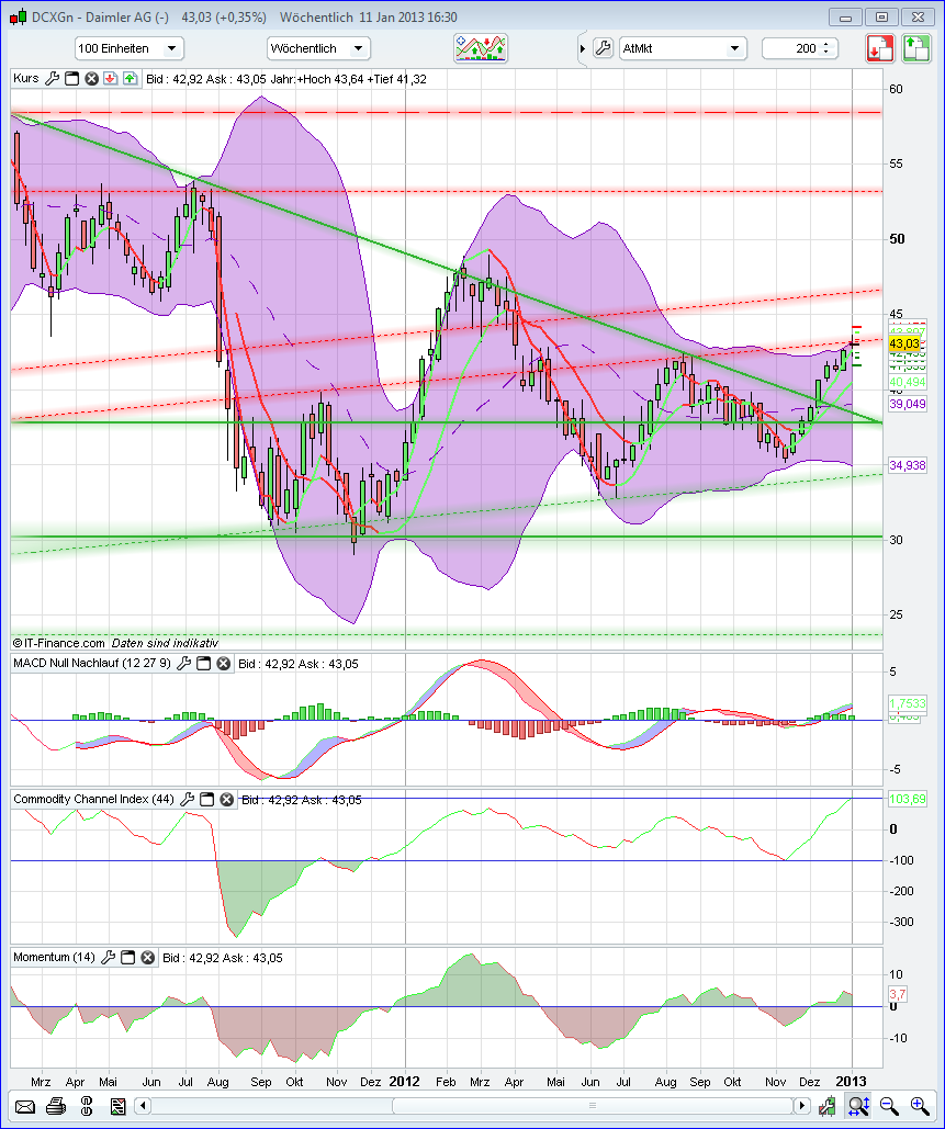 Im weekly (Wochenchart) ist klar erkennbar der Aufwärtstrend seit dem 16.11.2012. - Bei 12.471,5 nach oben abgeprallt - geht es unverändert - mit nur kleinen Rücksetzern (bei 12883) oder Seitwärtsbewegungen nach oben.