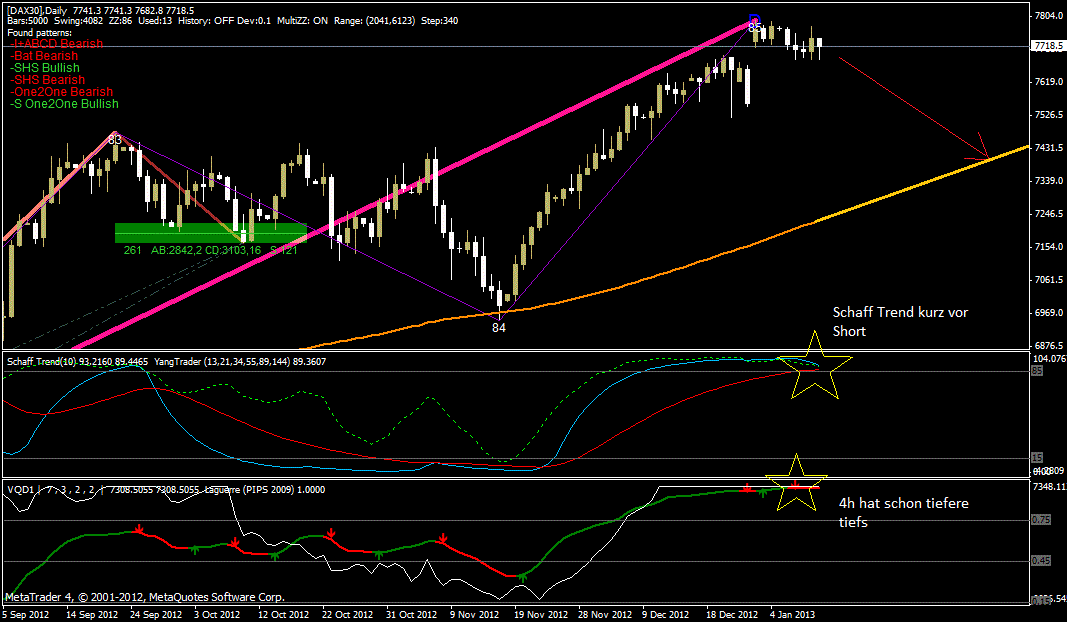 Die im Ansatz zu erkennende, sich über Monate spannende SKS wurde nicht vollendet: exakt fügten sich die News zur Überwindung des "fiscal-cliff" und der Abfall vom Top der rechten Schulter, der durch dieses Ereignis abrupt durch eine große, grüne Kerze gestoppt wurde: Welch ein starker, grüner Phallus im Weekly! (Lachen....)