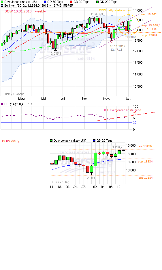 Die Divergenzen im RSI sind unverändert ansteigend und es ist noch "Luft" nach oben - noch ist der DOW längst nicht "am Anschlag". Klares Ziel im Aufwärtstrendkanal ist das Jahreshoch bei 13661 vom Oktober ´12. ( Hat der Dax dies doch in seinem fulminanten Anstieg längst überwunden.) Darüber läge, sehr ambitioniert, das 161,8er fibo-retracement bei 13827 Punkten.