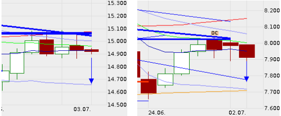 Ziele sind nach dem 4. Mal scheitern am mBB nun endgültig Unten zu suchen. Positiver wird das Ganze erst ab 14961 und mBB 15005 sowie nach überschreiten des Abwärtstrends 15045 und 15070 dann strong long. Unterhalb 14925 ist strong short angesagt.
