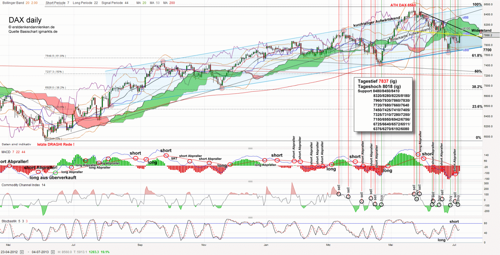 So wo stehen wir auf unserer Karte ... wir sind am gelben Sueskanal ... ähhh an der gelben Begrenzung angelangt, normal wäre nun das abtauchen runter zur blauen denn so lief das Spiel der letzten Tag ... aufgrund des Funkgerätes jedoch ... ähhh meine der Arbeitsmarktdaten morgen kann es sein, dass mit dem heutigen Wind in den Segeln die schwarze Linie und somit der Ursprünglich MAX POINT (siehe alte Charts 1.7.2013 www.erstdenkendannlenken.de/index.php4?cat=daxdaily) wieder interssant wird und somit das große 3eck bei 8100 ...