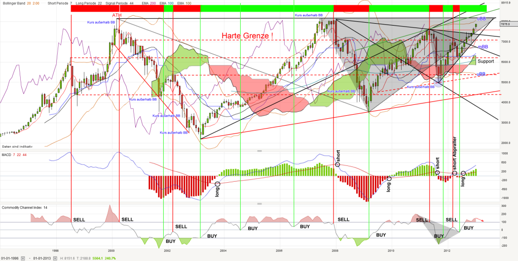 schaut man sich den weekly an und verbindet die 4 letzten hochs zur oberen TL dann müßte es höchstwahrscheinlich bei spätestens 14000 einen rücksetzer zur UBB geben.Oft kommt ne grüne wochenkerze nur 1-2 mal übers OBB hinaus, dann folgt schon der absturz..