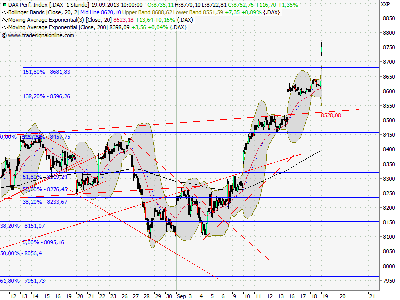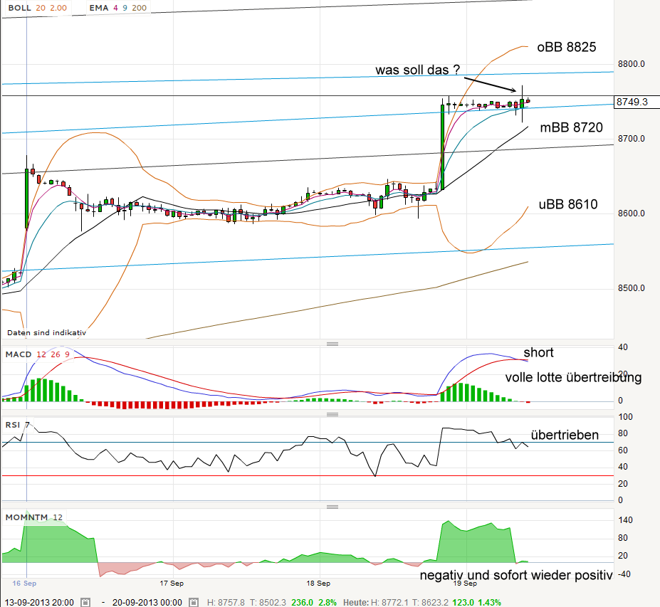 "satten Impulse nach unten" den Leuten, die hier seit Wochen short sind? Rein gar nichts, einzig die daytrader freuen sich. Diese "satten Impulse nach unten" wurden ja auch schon bei 8.5/8/ usw. angekündigt ... . Ende Juli war die letzte wirklich Bärchenphase/-Chance, seitdem nur noch aufwärts. Selbst wenn es nun zurücksetzt, wo landen wir dann? 8000 (mal bei helmut auf den chart schiel :) ...) ? Das ist eine Marke, die wurde vor wenigen Monaten noch von vielen voll investierten Bären hier im thread als endgültig abgehakt und verlacht, da nun der große crash anstünde ... .