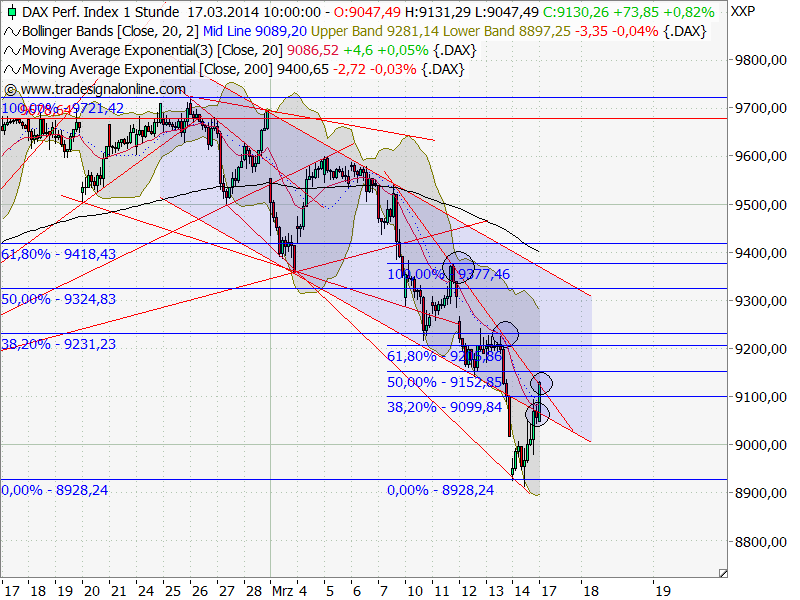 Die Sanktionen werden "milder" ausfallen, als angenommen. Ich bin von einer konsequenteren Vorgehensweise der westlichen Staaten ausgegangen, aber da sich Lawrov und Jerry für eine Verfassungsänderung für die Krim am Samstag irgendwie einigen konnte (Quelle: NTV), möchte auch Amerika dieses Thema abhaken. Das Hauptaugenmerk liegt nun auf der Ostukraine. Wenn man da eine einigermaßen glückliche Lösung findet und Russlang entgegenkommen zeigt, ist der Schrecken vorbei (für die Börsen natürlich) und die Sanktionen werden nur ein Lippenbekenntnis bleiben und wir können uns auf eine Zwischenrally freuen. Das größere Problem, dass die Börsen belasten wird, ist und bleibt CHina. Sollten hier wieder die Schleusen geöffnet werden, dann kommen wir wieder zurück in den Aufwärtstrend und dann kann das ATH wieder in Angriff genommen werden.