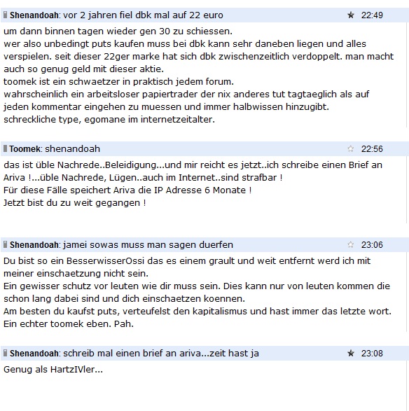 Hier die Antwort von Shenondoah, der auch gelegentlich sich im QV blicken lässt, mich verfolgt, beleidigt, beschimpft und provoziert. Das gleiche gilt auch für XL, der auch hier oft genug provoziert hat. Ich habe diese Forumsnutzer schon oft gemeldet. Aber es passiert nix. Die Beiträge werden gelöscht.Sehr schlechte Ariva-Moderationsarbeit !