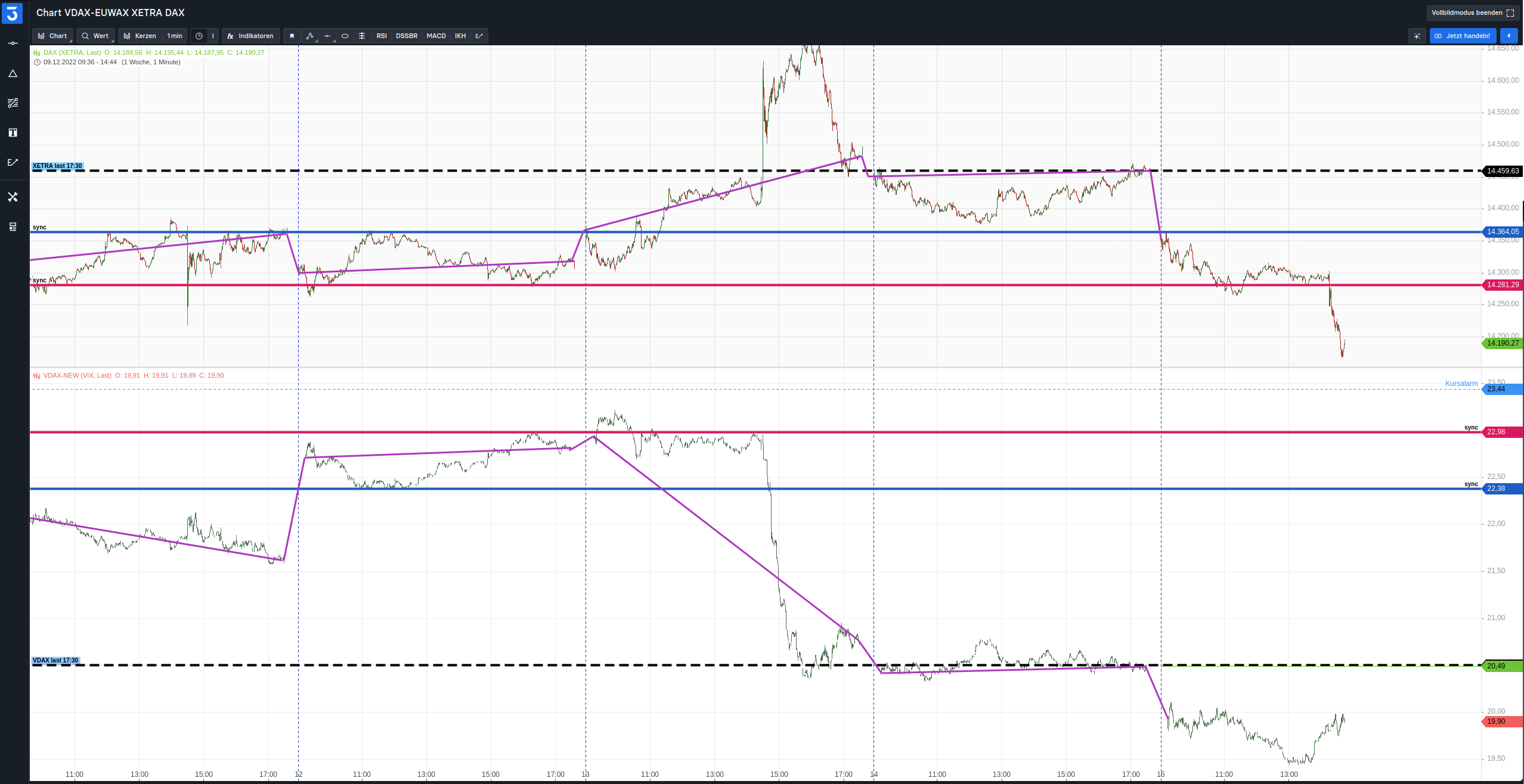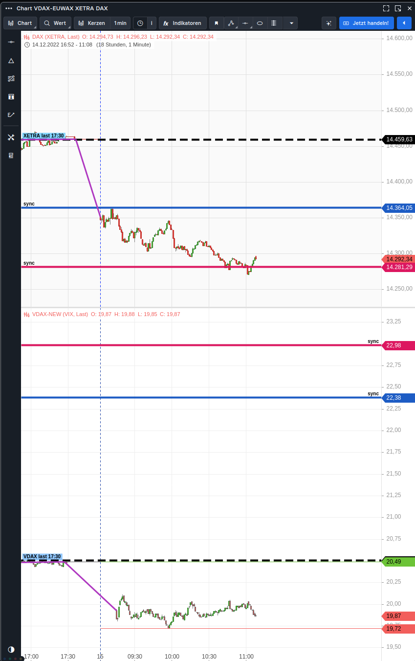 gemäß meiner Regel sollte XETRA sich aktuell bei >14500 befinden. - XETRA fällt - VDAX fällt = Anomalie Daher Vorsicht mit short ________ rot und blaue Linien dienen zum synchronisieren der Maßstäbe beider Graphen