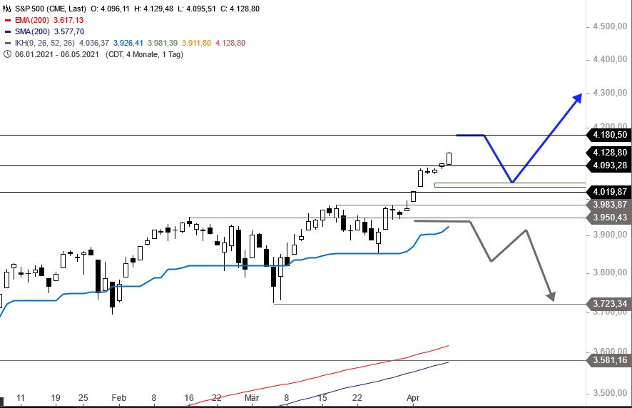 Der Dax scheint noch in seinem Osterei gefangen zu sein, da macht sich die Tante Erna schonmal auf zu neuen ATH'S. Gestern hat der US-Future ES mal die 4100er Marke geknackt, denke aber hier schaut keiner mal auf den Future, trotzdem fettmolly Glückwunsch an die Indianer. Ein wenig Platz nach oben haben die Jungs im SPY noch bis ca. 4180 für die nächste Woche und bis 4300 in den nächsten 30 Tagen. Das sagt zumindest der Vix Vola Index - was sie davon dann mal abholen werden wir in der nächsten Woche(n) sehen. Der Hinweis auf saisonal/berichtssaison steht ja schon oben muss man ja nicht wiederholen. Wichtiger Support liegt bei ca. 4050 der sollte dann aber halten, wenn sie es ernst die Wochen meinen. Für die Freunde des Ichimoku und der EMA hab ich mal die interessanten Indikatoren aufgenommen, können ja unsere Permabären und und Dauershorter mal selbst drauf schauen, wird erst ab 3950 für mich interessant. Das wäre dann ein richtiges rumstatü. Gutes gelingen den Kollegen hier und schaut nicht soviel Trashvideos.