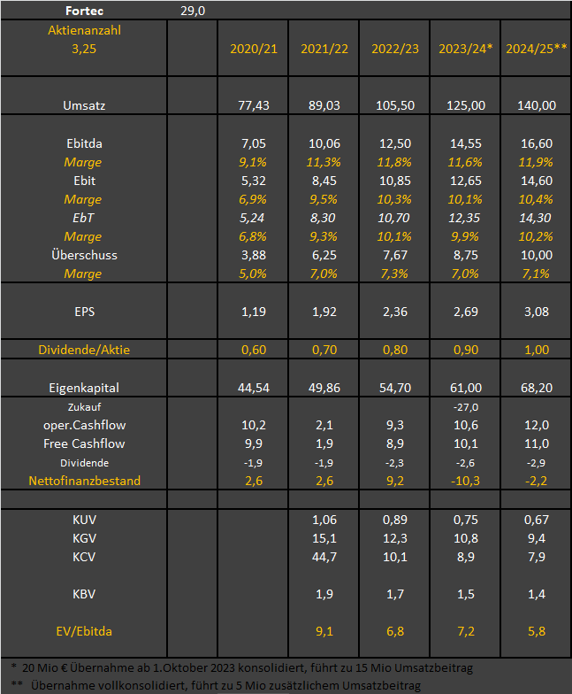 Bei einem KGV von 14,0 und KUV von 1,0 für das Geschäftsjahr 2024/25 würde das Kursziel bis Q4/24 bei 43,0 € liegen. Eigentlich würde ich Fortec eine höhere Bewertung zugestehen, aber vorläufig würden mir diese knapp 50% Kurspotenzial auf Sicht von 15 Monaten genügen.