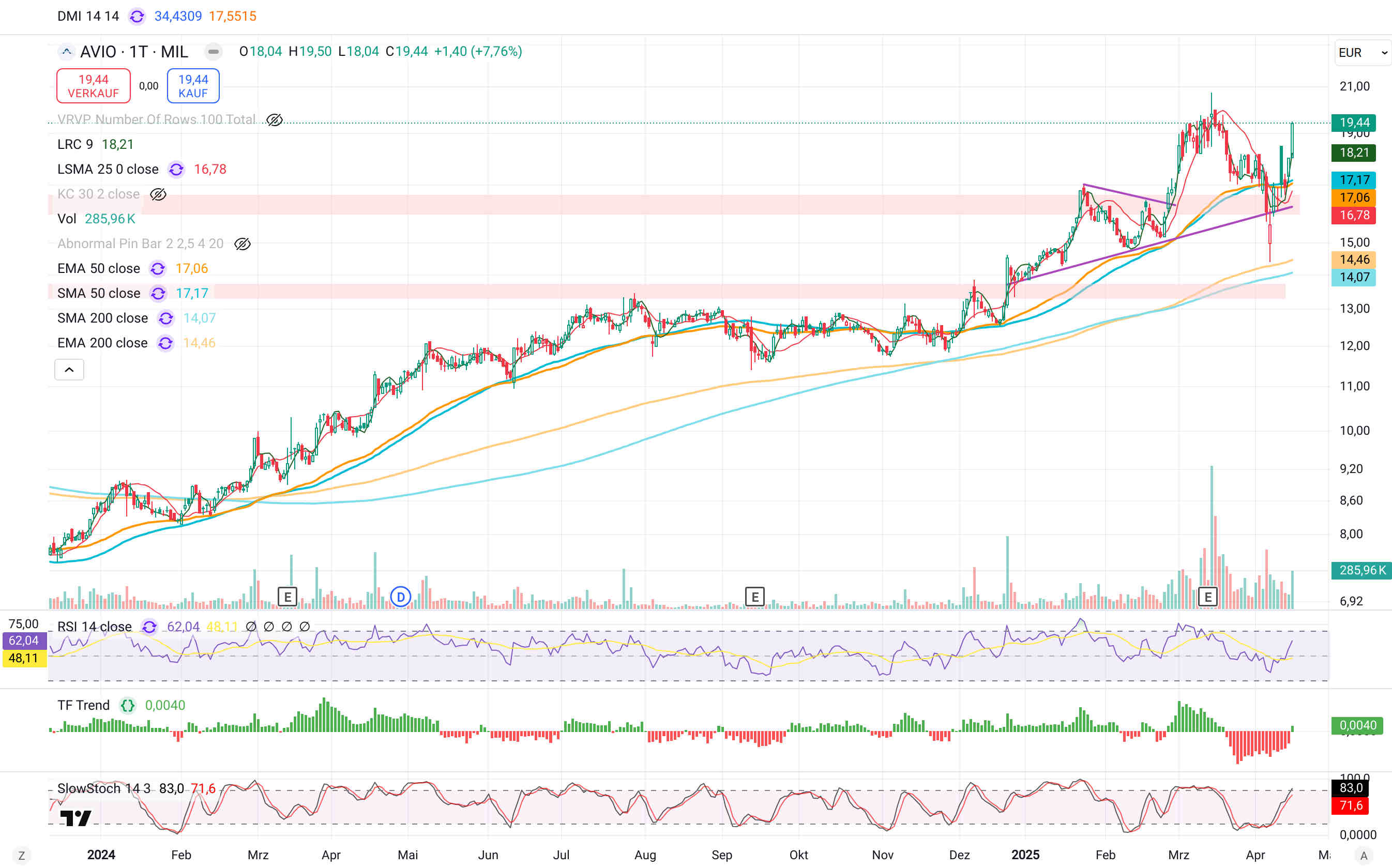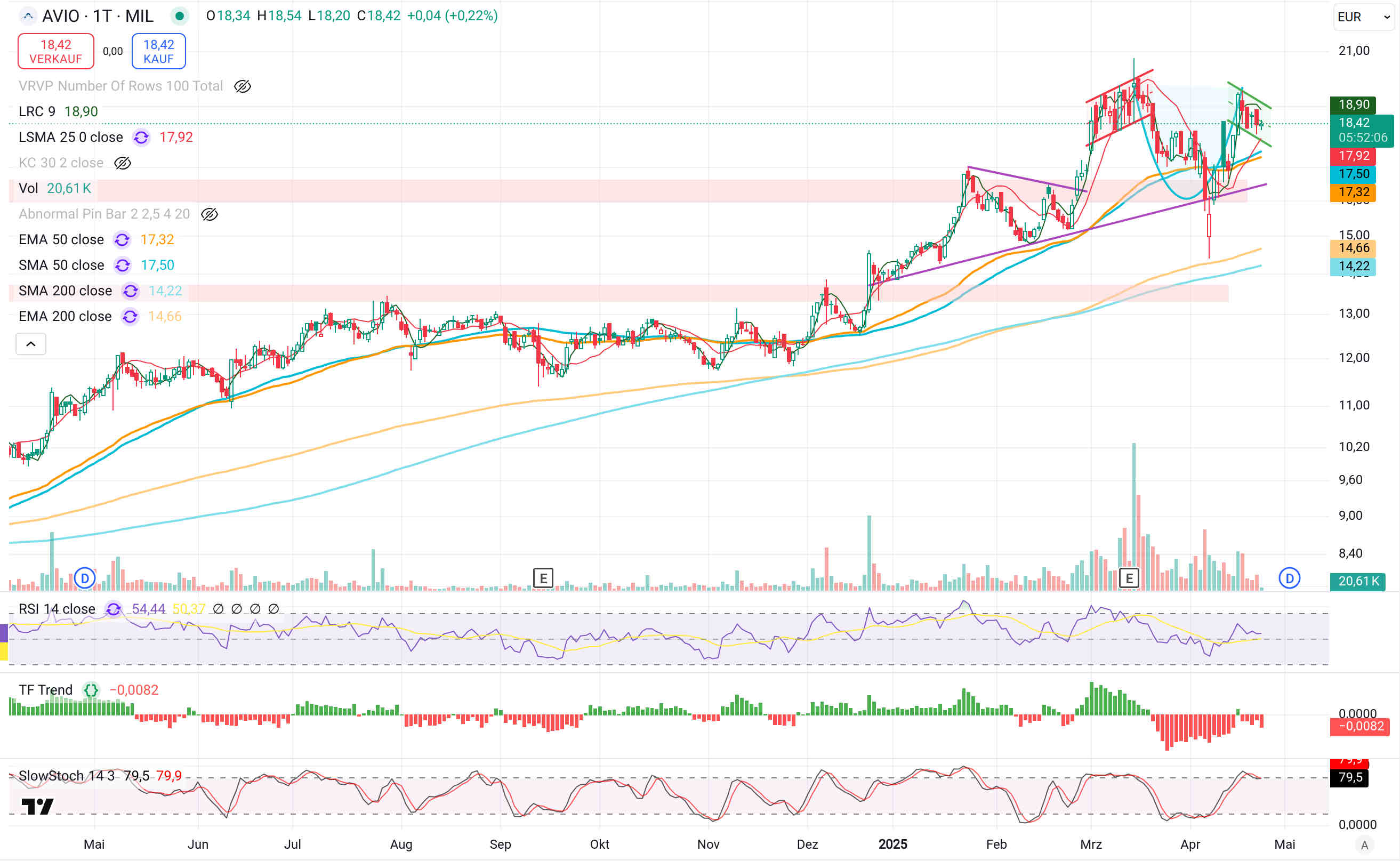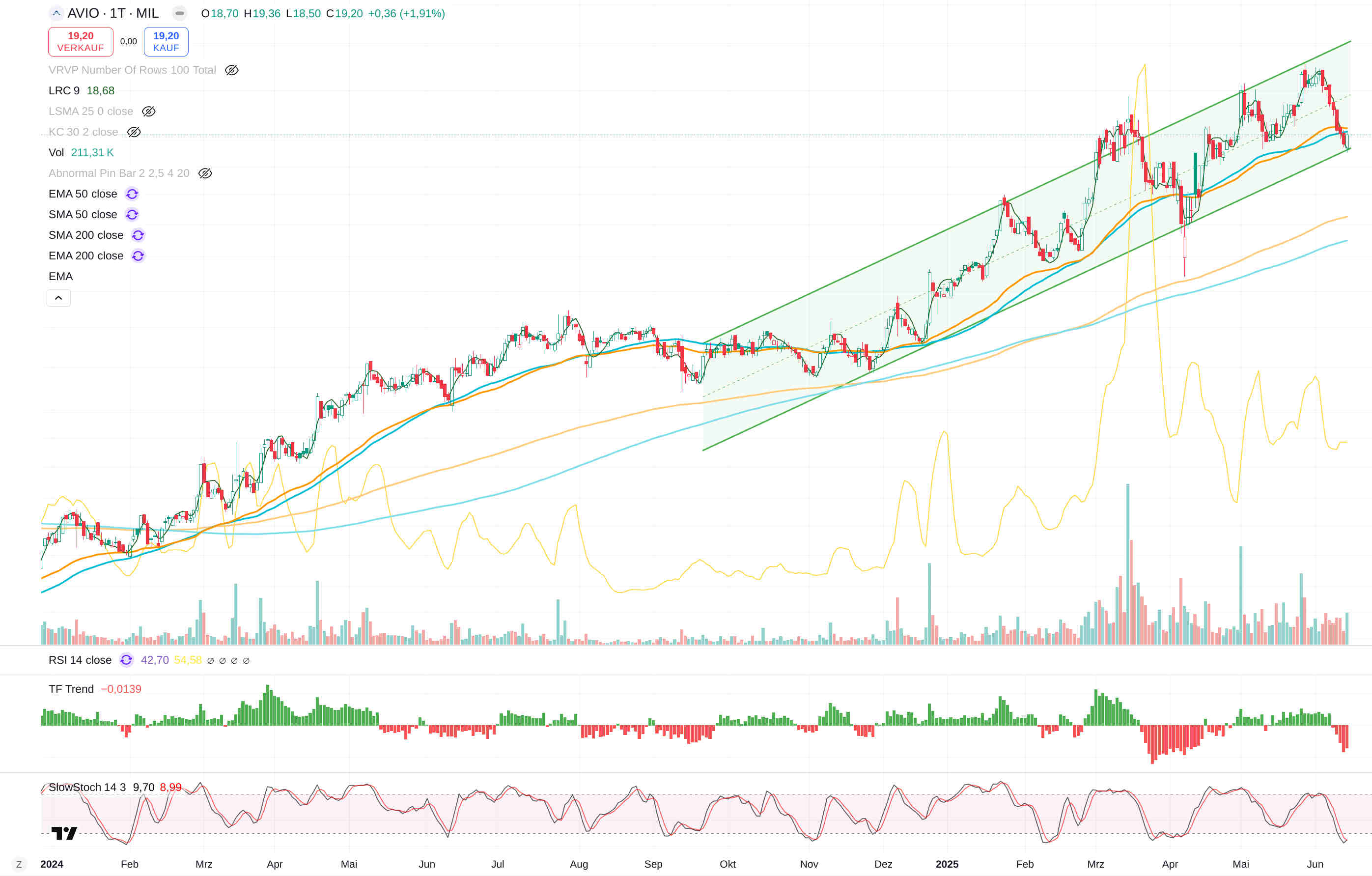 Ein nicht so negatives Bild zeigt sich bei Avio, hier sehe ich aber ebenfalls einen Ansatz einer bärischen Konsolidierung und hohe Wahrscheinlichkeit eines Rückfalls mind. zum Aufwärtstrend.