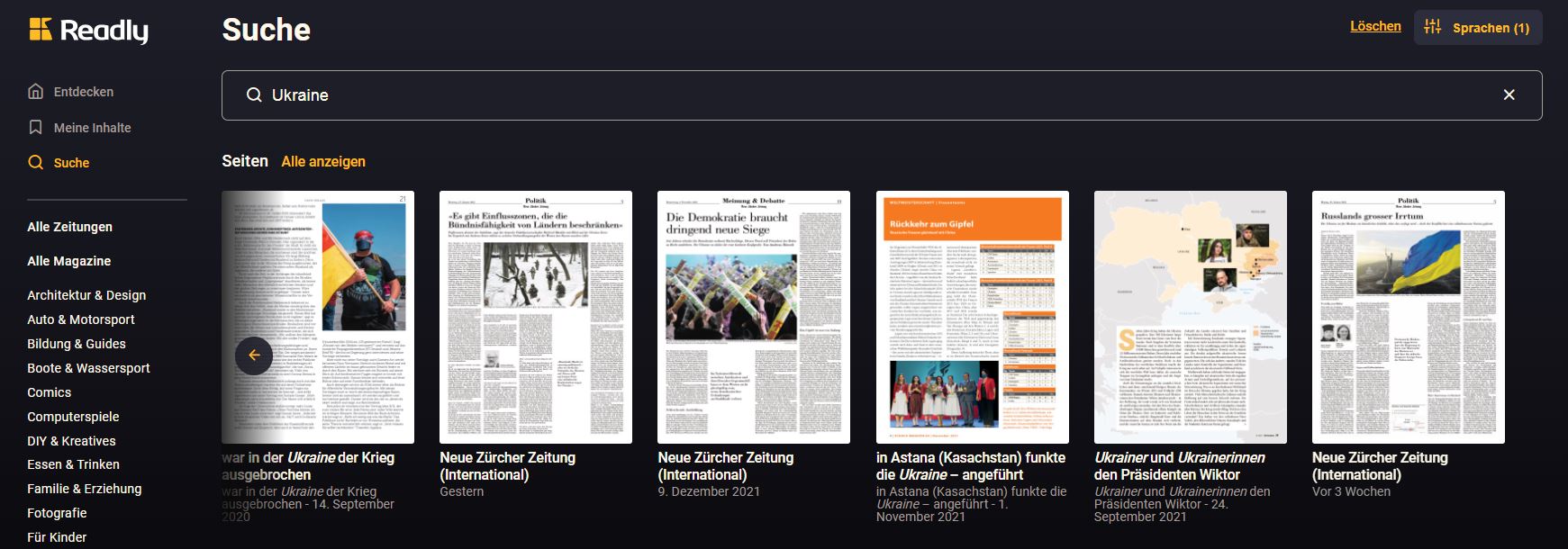 Readly muss kreative Ideen ausprobieren und nicht auf dem stumpfen Konzept verweilen, Magazine einfach in eine App zu übertragen. Hier vorgeschlagene Dinge wie eine "Stichwortsuche" wären genial. Ich suche ein Stichwort z.B "Ukraine" und bekomme viele verschiedene Einzelartikel von verschiedenen Positionen angezeigt.